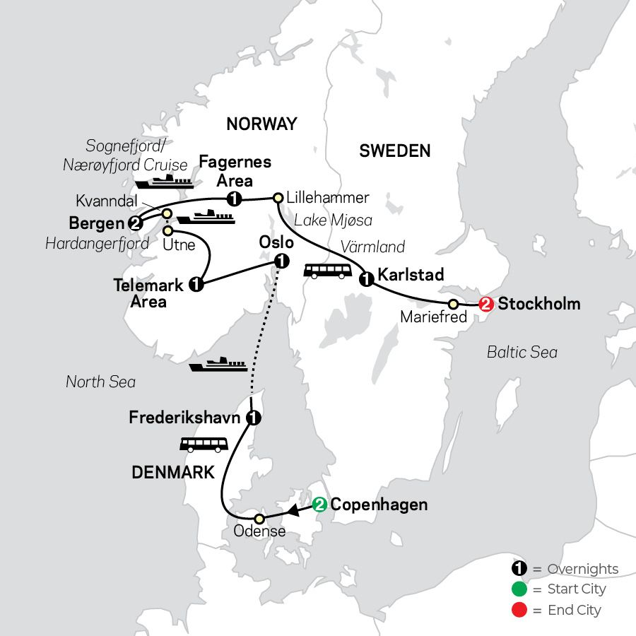 12 days | 3 countries | Copenhagen to Stockholm | Now from $4,449pp Your Tour Includes: • Orientation drive in Copenhagen including the Little Mermaid statue • Scenic drive along the Great Belt Bridge and Little Belt waterway • Orientation tour of Odense, home of Hans Christian Andersen • Orientation tour of Frederikshavn • Ferry ride from Hirtshals to Kristiansand • Guided sightseeing in Oslo • Orientation tour and scenic drive of Telemark area • Ferry crossing on the Hardangerfjord • Picture stop at Steinsdalsfossen Waterfall • Orientation tour of Bergen • Cruise on the Sognefjord featuring sights of the Nærøyfjord • Orientation tour of the Fagernes area • Orientation tour of Lillehammer • Scenic drive along Lake Mjøsa and through Värmland • Orientation tour of Karlstad • Orientation tour of Mariefred with photo stop at Gripsholm Castle • Guided sightseeing in Stockholm • Visit to Stockholm City Hall